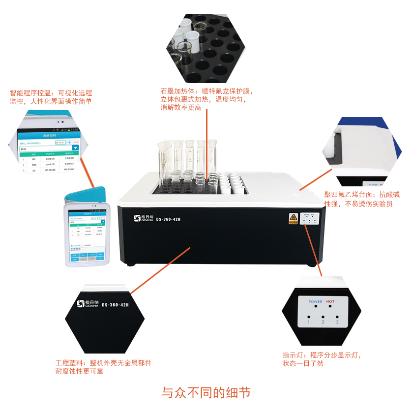 高純石墨作為加熱體,耐腐蝕;聚四氟乙烯臺面,整機外圍防腐處理,可在強酸強堿等惡劣環境中放心使用。
