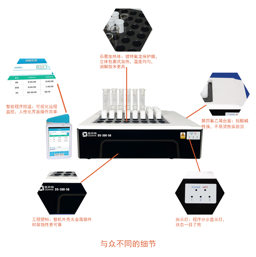 DS-360-56智能石墨消解儀具有56孔高通量設(shè)計(jì),可快速實(shí)現(xiàn)樣品批量處理,滿足樣品量大的消解用戶;石墨材料作加熱體,孔間溫差±1.5℃,溫度均性好;無線控制,有效避免人員被酸霧及熱量傷害;設(shè)備操作簡(jiǎn)單,消解快速,是樣品元素分析時(shí)消解的好助手。