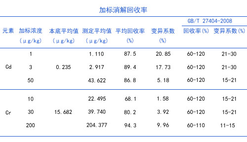 本試驗采用的石墨消解儀硝酸濕法消解方式,僅需1次前處理方法,可以同時檢測鎘、鉻、2種重金屬元素,操作簡 便,試劑耗材消耗量少,節約了成本,石墨消解儀具有批處理量大且無需實驗人員值守的優點,安全性系數高,一 般性實驗室均可采用。