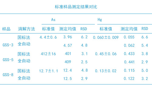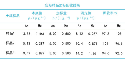 對(duì)3份實(shí)際土壤樣品加標(biāo),結(jié)果見下表。由表中可知,全自動(dòng)石墨消解法處理樣品,砷和汞的加標(biāo)回收率分別為94.6%~104%和92.6%~105%。試驗(yàn)說(shuō)明,該方法測(cè)定土壤中的砷和汞,準(zhǔn)確度和精密度均能滿足質(zhì)量控制的要求。