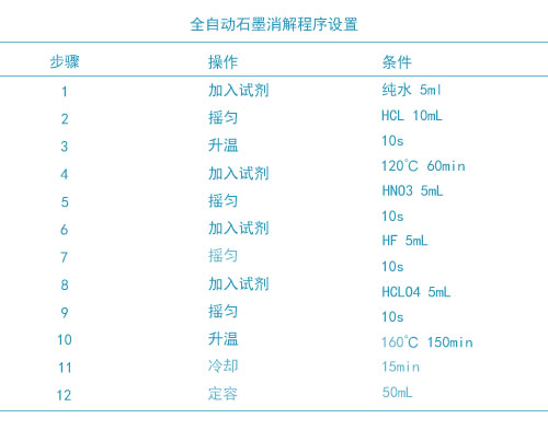 本次試驗使用HCl-HNO3-HF-HClO4混合酸消解體系,將土壤中的晶格全部打開,進行全消解。因用酸量較少,只需準確稱取0.1000-0.2000g左右干燥土壤樣品至特氟龍消解管中,放入全自動消解儀石墨孔中,設(shè)置好系統(tǒng)消解方法只需要一鍵啟動就可以自動加酸、搖勻、加熱消解、趕酸、定容。全自動石墨消解儀系統(tǒng)的消解程序及條件見表下面表格。全自動消解儀自動定容到50mL,每批樣品加做雙份全程序空白。
