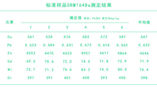 將石英纖維濾膜剪碎置于消解管中,全自動消解儀取整張濾膜,準確稱量0.03g城市可吸入顆粒物標準樣品SRMl648a加入每個濾膜樣品,分別按照上述消解條件進行消解,每種消解方式制備6組樣品,同時做空白實驗。測定結(jié)果見表。
