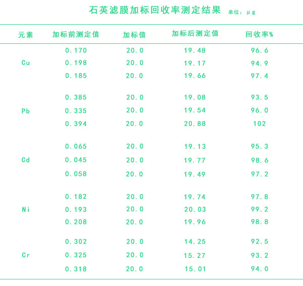將整張石英纖維濾膜剪碎置于消解管中,準確移取2.0mL加標測定回收率,分別按照上述消解條件進行消解。同時做空白實驗。制備3組樣品,測定結(jié)果見表。