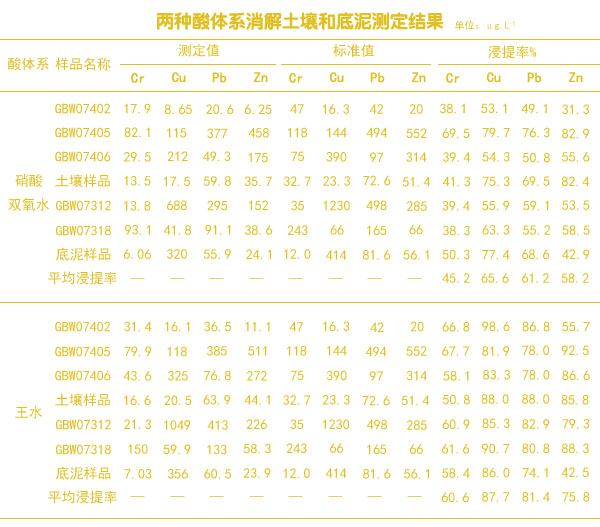 釆用硝酸-雙氧水和王水消解土壤和底泥樣品,由于沒有加氫氟酸飛硅的步驟,因此消解液中留有殘渣,用中性濾紙過濾后定容,因此濾紙空白值的大小直接影響方法檢岀限和測定結果。本研究對兩種體系均進行了空白值實驗,表(兩種酸體系樣品空白值測定結果)中的結果表明該前處理體系試劑空白低,可以適用于浸提。