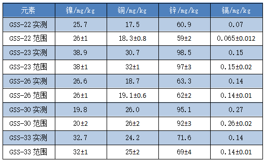 實驗發現除GSS-23的銅元素檢測值略低于不確定度范圍, GSS-30的鋅元素檢測值略高于不確定度范圍,其余樣品的四類元素檢測結果均在標準值不確定度范圍之內,滿足實驗室土壤檢測實驗的要求。