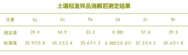 對ESS-1土壤標準樣品(國家環保總局標樣研究所),采用電熱板消解方法進行消解,并分別測得樣品中的Cu、Zn、Pb、Cd、Cr、Ni元素的含量,見下面表格。
