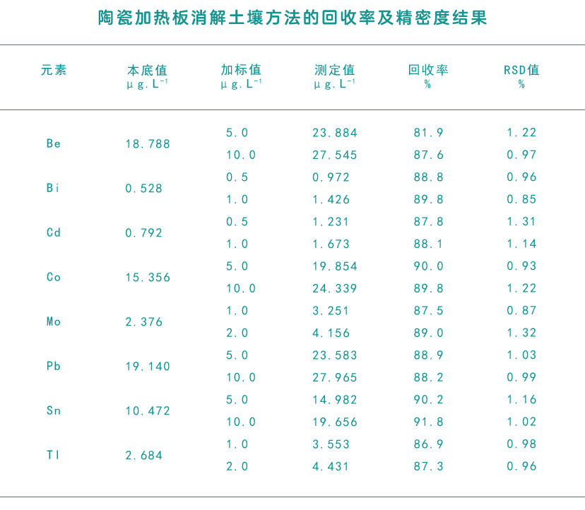 從表中的測定結果得出,三種樣品的重金屬元素測定值均在標準值范圍內,說明陶瓷加熱板消解方法準確度較好。