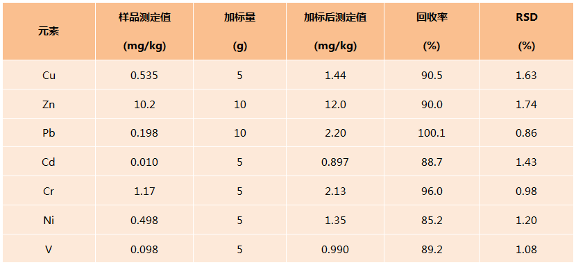 從給中可看出樣品測(cè)定精密度為0.86%-1.74%,回收率為85.2%-100.1%,滿(mǎn)足實(shí)驗(yàn)要求,實(shí)驗(yàn)室數(shù)據(jù)可靠有效,訪(fǎng)方法可用于其它同類(lèi)樣品的消解。