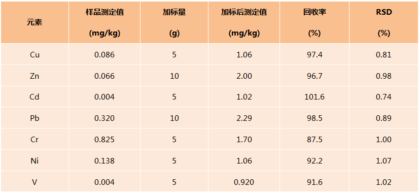 根據(jù)上述的方法,用陶瓷電熱板消解糖蜜后測(cè)定Cu、Zn、Pb、Cd、Cr、Ni、V7種元素加標(biāo)回收率及精密度所以下表所示。